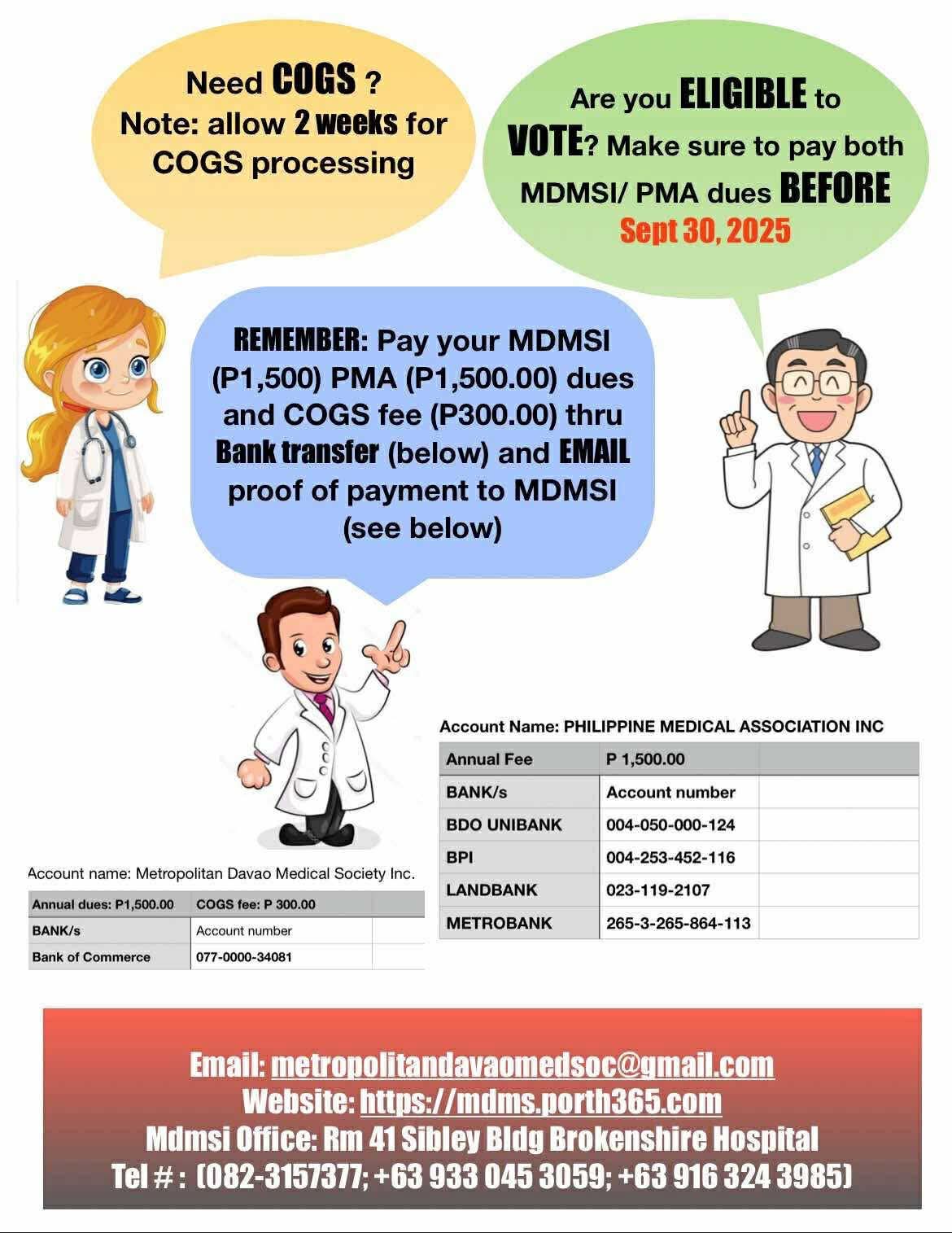 For Regular Members, to maintain good standing status, an annual fee of P1500.00 for MDMSI and P1500.00 for PMA should be settled on June 1-September 30 of the Current Fiscal Year. September 30 of each fiscal year is the deadline to be a member of good standing both for local and national membership dues.